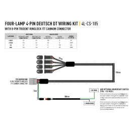 Die ideale Lösung für die Verkabelung eines Paares von Lazer Carbon-6 (Gen3) Hochleistungs-LED-Fernscheinwerfern. Die schnelle, einfache und zuverlässige Einrichtung mit ITT-Cannon Steckern erfordert keine Konfiguration. Der Bausatz verfügt über ein 12-V-Relais, eine Sicherung sowie über einen Batterieanschluss an einem Ende und 1,85 m Flexkabel an den Scheinwerferkabeln. Der Kabelsatz ermöglicht den Betrieb von zwei Lampen über einen Ein/Aus-Schalter, der im Cockpit Ihres Fahrzeugs montiert werden kann.