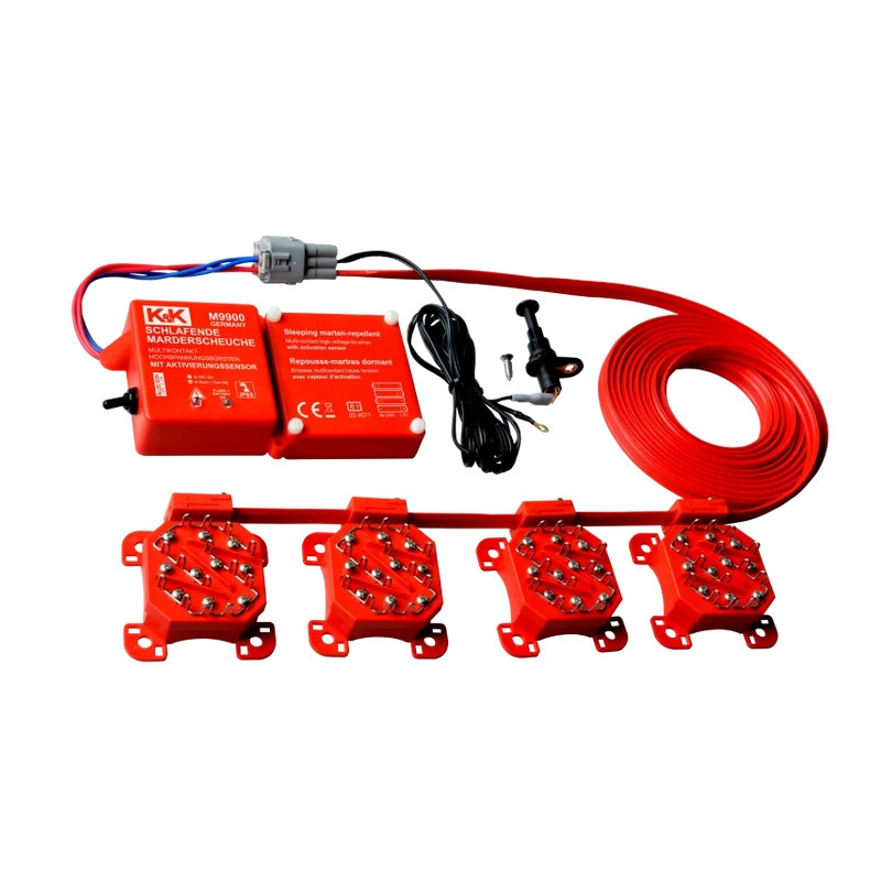 Hochspannungsabwehr ist gerade bei besonders aggressiven Tieren im Revierkampf und „Veteranen“ mit veränderter Hörschwelle unumgänglich. Als besonders effektiv haben sich hierbei die felldurchdringenden K&K +/- Hochspannungsbürsten bewährt, weshalb sie auch beim M9900 in 4-facher Ausführung zum Einsatz kommen. Im Gegensatz zu herkömmlichen Kontaktplatten kämmen die Edelstahlbürsten durch das Fell und so bieten nicht nur Pfote und Schnauze eine Angriffsfläche, sondern der gesamte Körper des Eindringlings. Aufgrund der wasserdicht vergossenen Elektronik, kann das Gerät besonders tief im Motorraum angebracht werden und agiert somit als „Türsteher“ für den besonders schutzwürdigen Eintrittsbereich des Marders. Die flexibel verschiebsowie erweiterbaren Edelstahlbürsten ermöglichen zudem eine optimale Anpassung an den jeweiligen Motorraum. Wird die Motorhaube geöffnet führt der Sicherheits-Motorhaubenschalter zu einem sofortigen Abbau der Hochspannung an den Kontaktplatten und ermöglicht somit ein gefahrloses Arbeiten. Selbstverständlich erfüllt auch diese Innovation die strengen OEM Anforderungen.